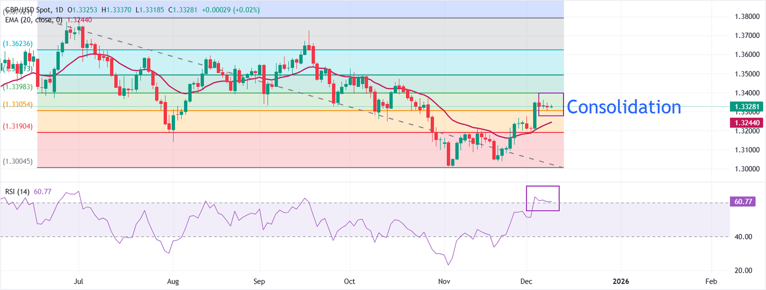 La Libra esterlina oscila en un rango ajustado por encima de 1.3300 frente al Dólar estadounidense el martes. El par se mantiene por encima de una media móvil exponencial (EMA) de 20 días en 1.3244, manteniendo un sesgo positivo a corto plazo. La EMA de 20 días ha subido en las sesiones recientes, y las caídas siguen siendo superficiales.