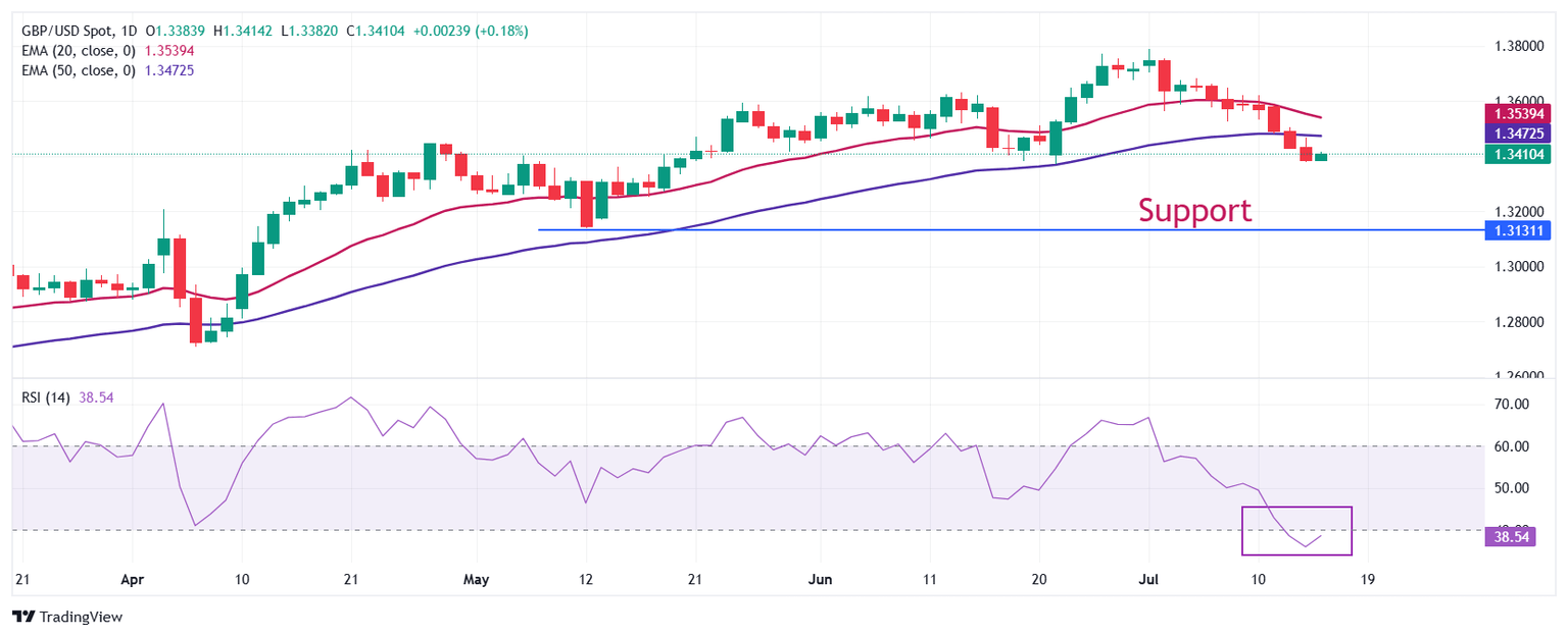 La Libra esterlina rebota cerca de 1.3400 frente al Dólar estadounidense el miércoles después de revisitar un mínimo de más de siete semanas alrededor de 1.3370 el día anterior. La tendencia a corto plazo del par GBP/USD se ha vuelto bajista ya que cotiza por debajo de las medias móviles exponenciales (EMA) de 20 días y 50 días en alrededor de 1.3540 y 1.3470, respectivamente.