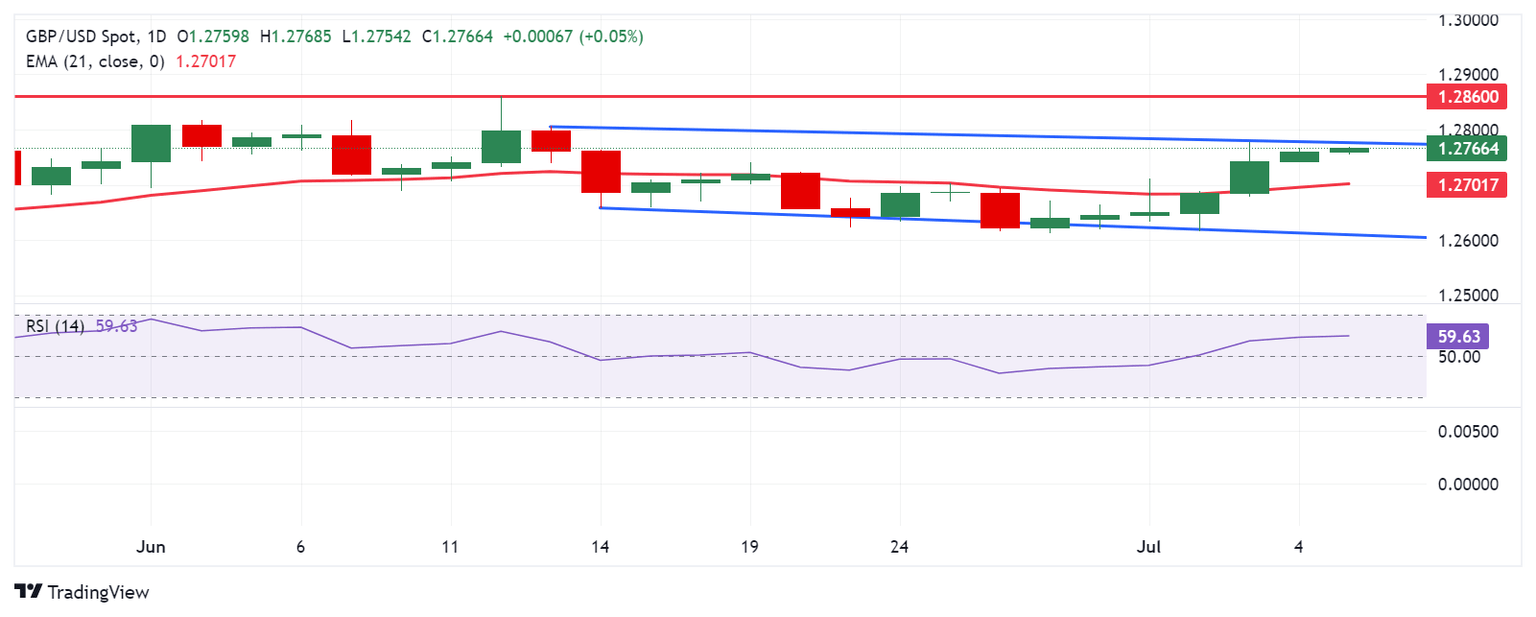 El par GBP/USD cotiza alrededor de 1.2760 el viernes. El análisis del gráfico diario indica un sesgo bajista, con el par consolidándose dentro de un canal descendente. Sin embargo, el Índice de Fuerza Relativa (RSI) de 14 días está por encima del nivel 50, lo que sugiere que cualquier aumento adicional podría debilitar la perspectiva bajista.