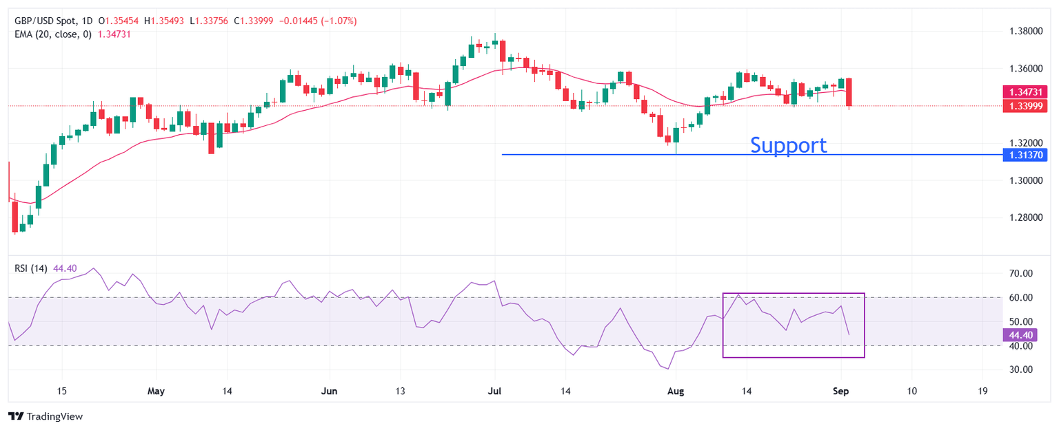 La Libra esterlina se desliza por debajo de 1.3400 frente al Dólar estadounidense el martes. La tendencia a corto plazo del par GBP/USD se torna bajista a medida que cae por debajo de la media móvil exponencial (EMA) de 20 días, que se negocia alrededor de 1.3468.