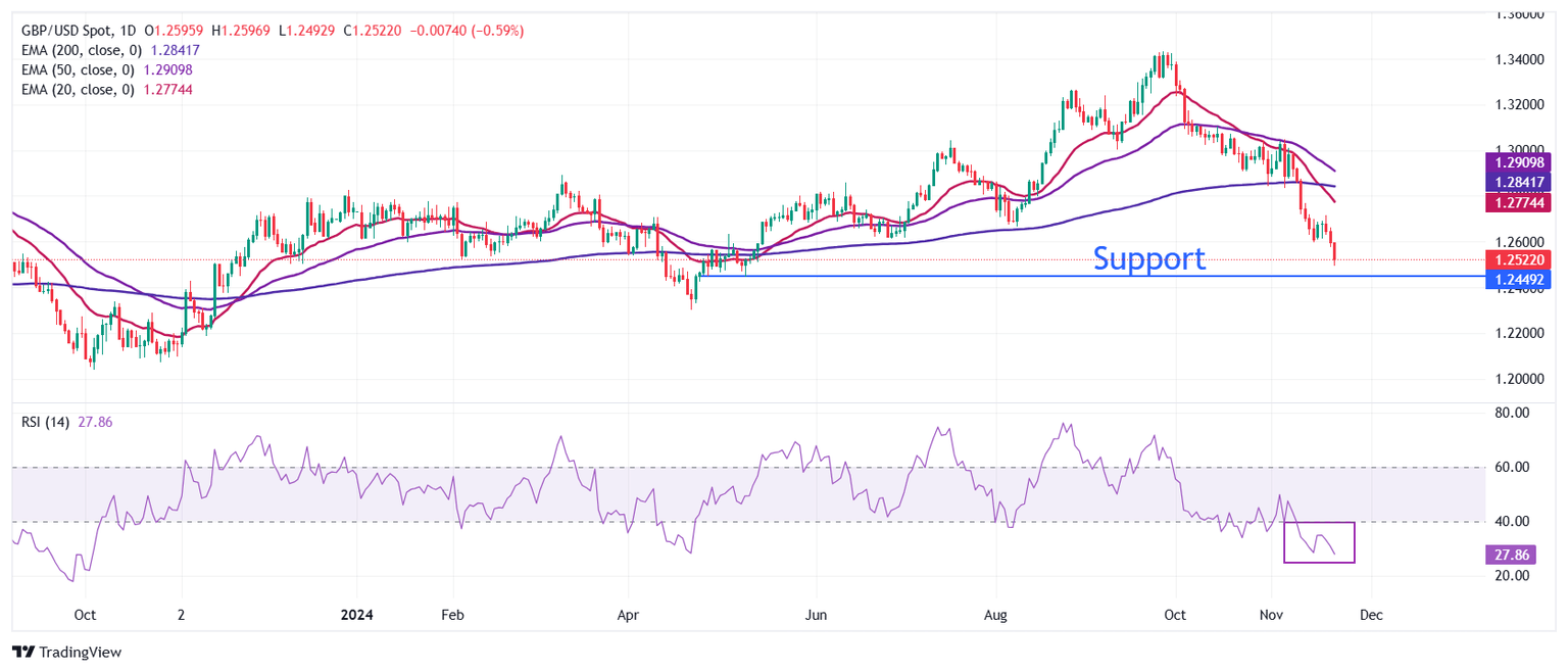 La Libra esterlina cae cerca de 1.2500 frente al Dólar estadounidense el viernes, extendiendo las pérdidas por tercer día consecutivo de negociación. La perspectiva del par GBP/USD se ha vuelto bajista, dado que todas las medias móviles exponenciales (EMA) de corto a largo plazo están inclinadas hacia abajo.