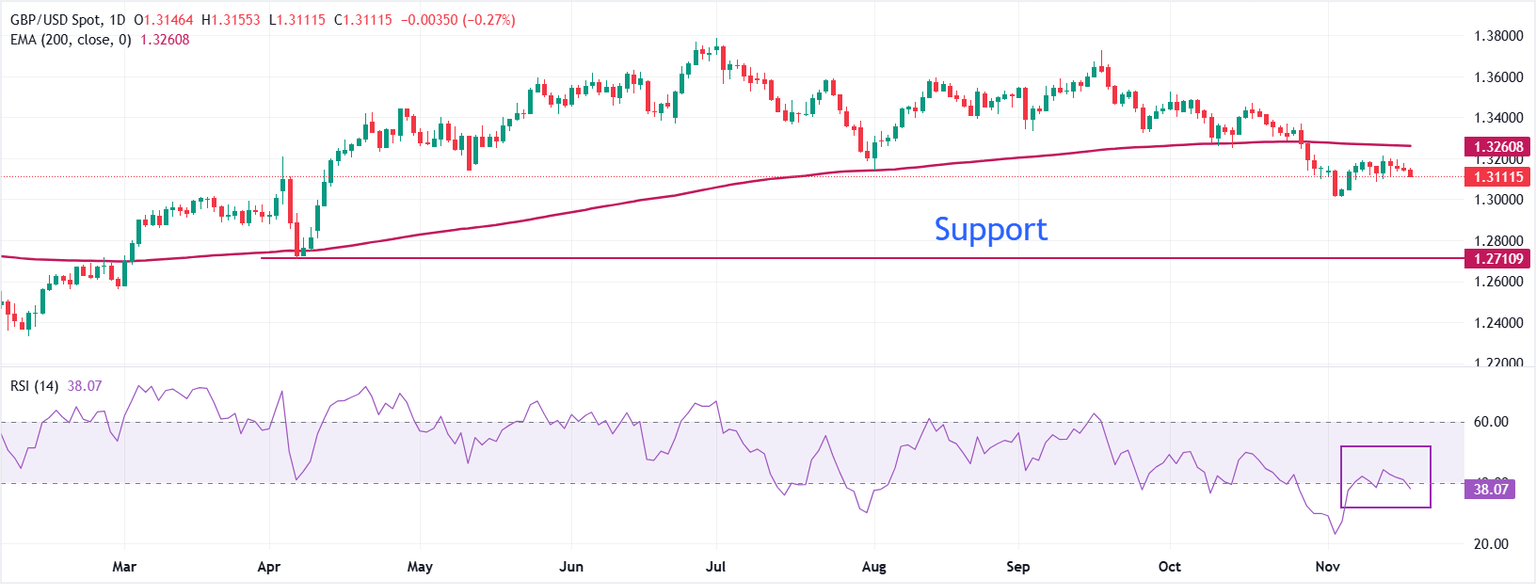 La Libra esterlina se desliza cerca de 1.3100 frente al Dólar estadounidense el miércoles. La tendencia general del par GBP/USD sigue siendo bajista ya que se negocia por debajo de la media móvil exponencial (EMA) de 200 días, que está alrededor de 1.3264.