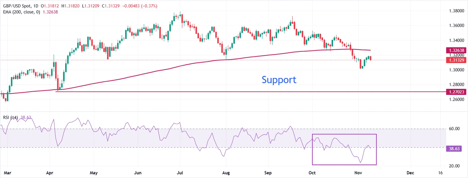 La Libra esterlina desciende a cerca de 1.3130 frente al Dólar estadounidense el martes. La tendencia general del par sigue siendo bajista ya que cotiza por debajo de la Media Móvil Exponencial (EMA) de 200 días, que está alrededor de 1.3264.