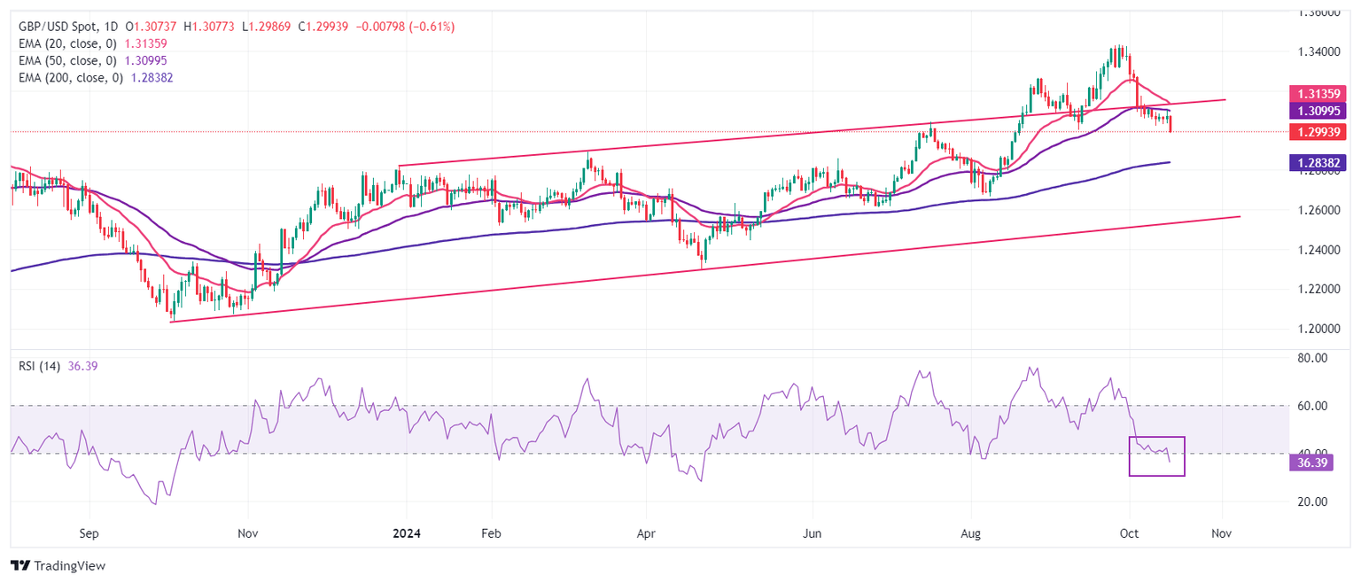 - La Libra esterlina prueba territorio por debajo del soporte psicológico de 1.3000 frente al Dólar estadounidense (USD) el miércoles. El Dólar estadounidense se mantiene a flote cerca de un máximo de más de dos meses, ya que los operadores han descontado recortes moderados de tasas de interés por parte de la Reserva Federal (Fed) en las reuniones de política restantes de este año, con el Índice del Dólar DXY manteniendo las ganancias cerca de 103.30. La Fed comenzó el ciclo de flexibilización de la política con un tamaño mayor de lo habitual de 50 puntos básicos (pb) en septiembre.