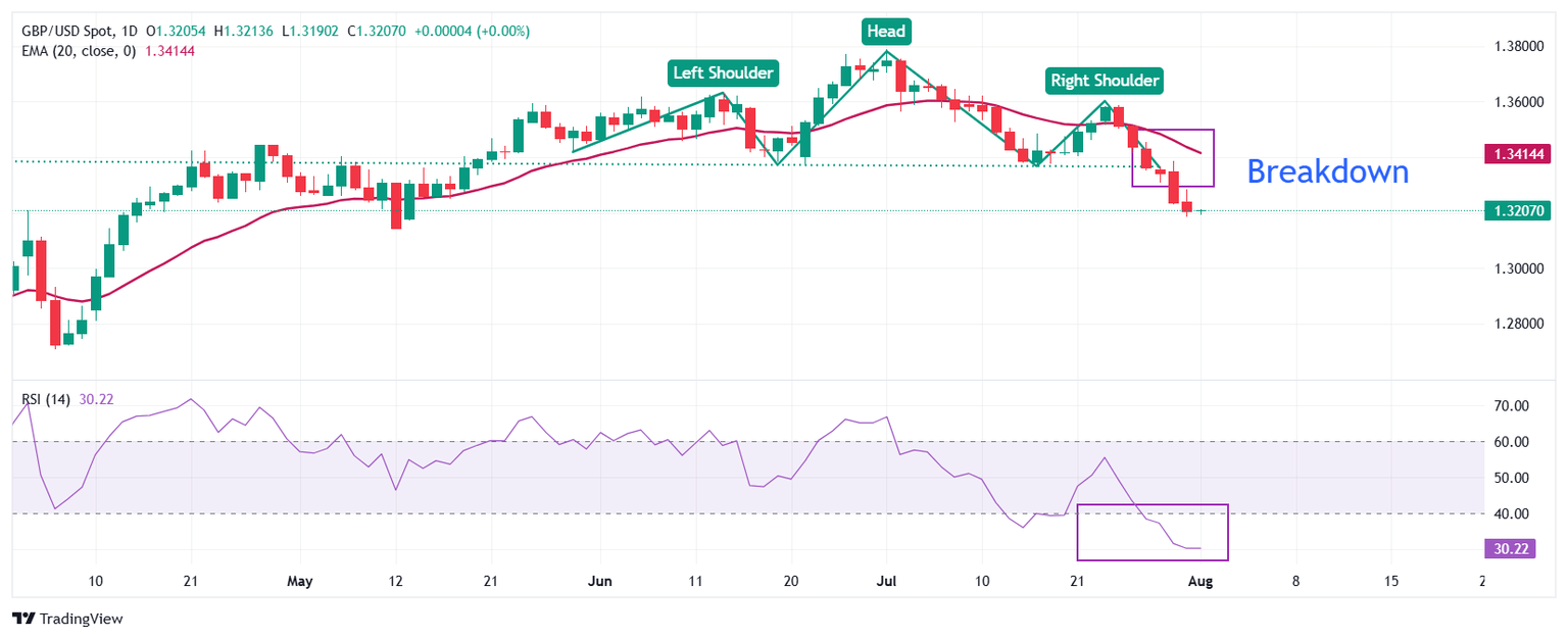 La Libra esterlina se desploma cerca de 1.3160 frente al Dólar estadounidense el viernes. Las perspectivas del par GBP/USD se han vuelto bajistas ya que ha roto por debajo de la línea de cuello de un patrón de gráfico de Cabeza y Hombros (H&S).