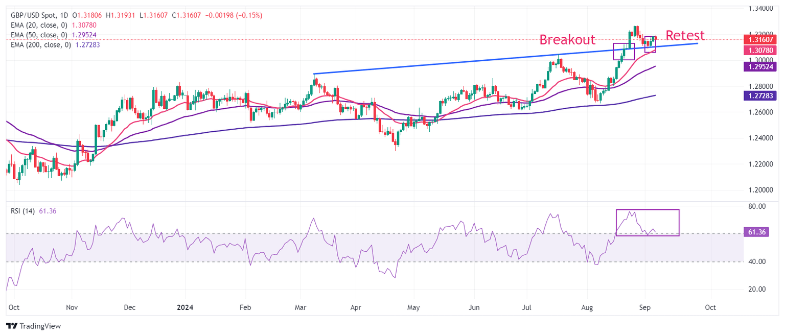 La Libra esterlina cae después de no lograr mantenerse por encima de 1.3200 frente al Dólar estadounidense. La perspectiva del par GBP/USD sigue siendo firme ya que mantiene la ruptura de una línea de tendencia ascendente trazada desde el máximo del 28 de diciembre de 2023 de 1.2828 en el marco de tiempo diario.
