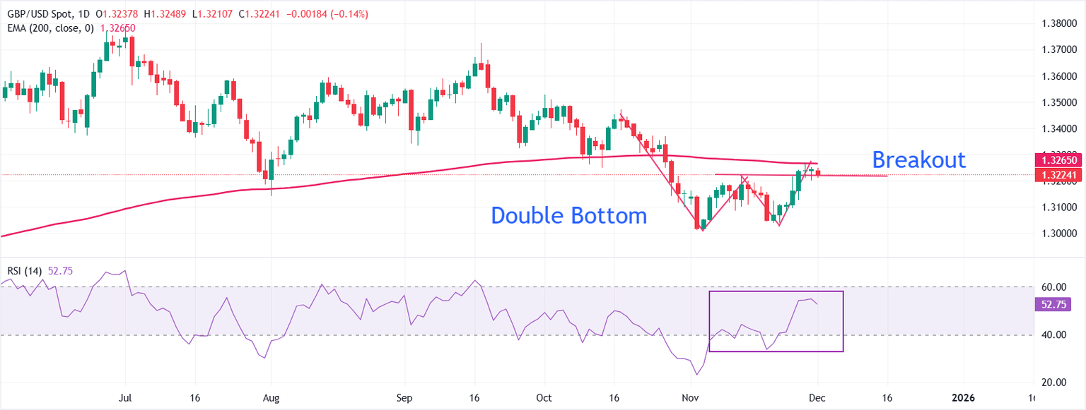 En el gráfico diario, el GBP/USD se negocia plano en 1.3224 y se espera que atraiga ofertas significativas, ya que una ruptura de una formación de Doble Suelo ha establecido una reversión alcista. Sin embargo, la Media Móvil Exponencial (EMA) de 200 días cerca de 1.3265 sigue actuando como una barrera clave para los toros de la Libra esterlina.