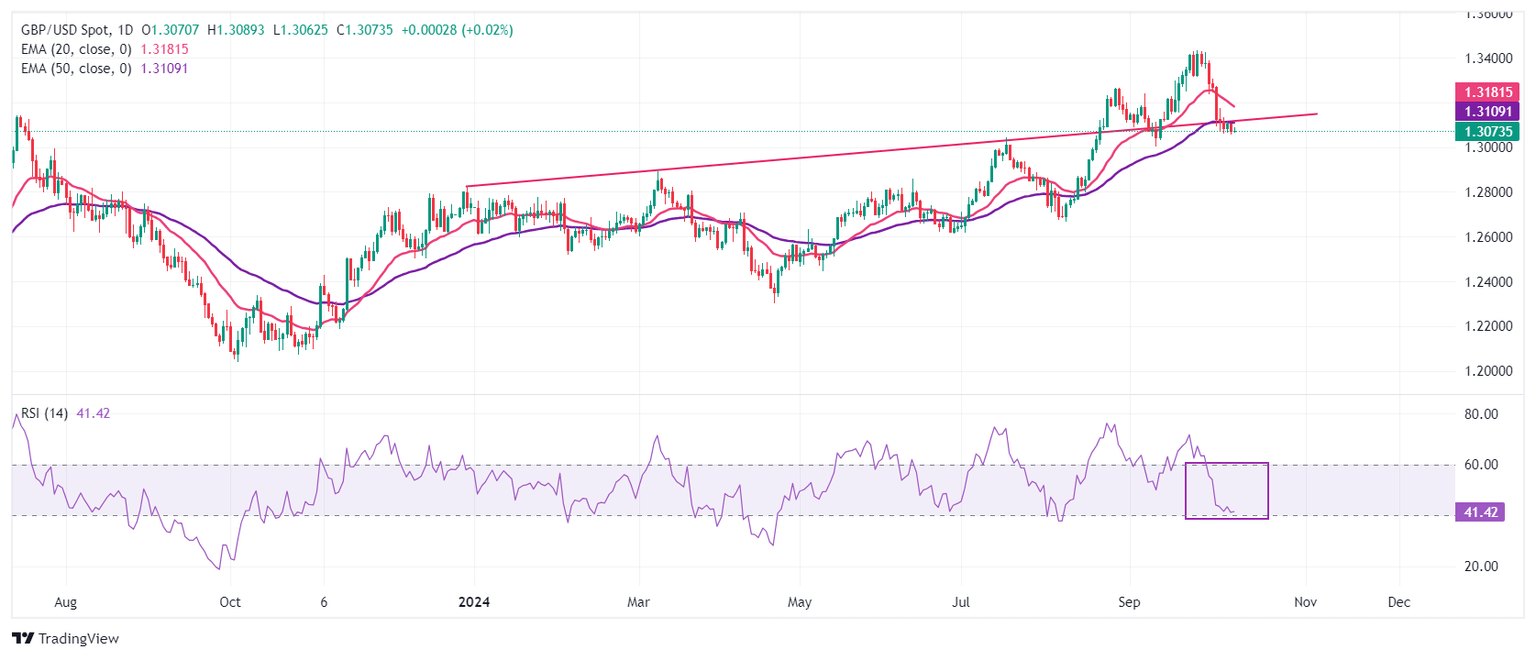 La Libra esterlina cae aún más cerca de 1.3000 frente al Dólar estadounidense. La perspectiva del par GBP/USD ya era vulnerable ya que se estabilizó por debajo de la línea de tendencia ascendente trazada desde el máximo de 1.2827 del 28 de diciembre de 2023. La tendencia a corto plazo del Cable es bajista ya que cotiza por debajo de las medias móviles exponenciales (EMAs) de 20 y 50 días, que cotizan alrededor de 1.3180 y 1.3110, respectivamente.