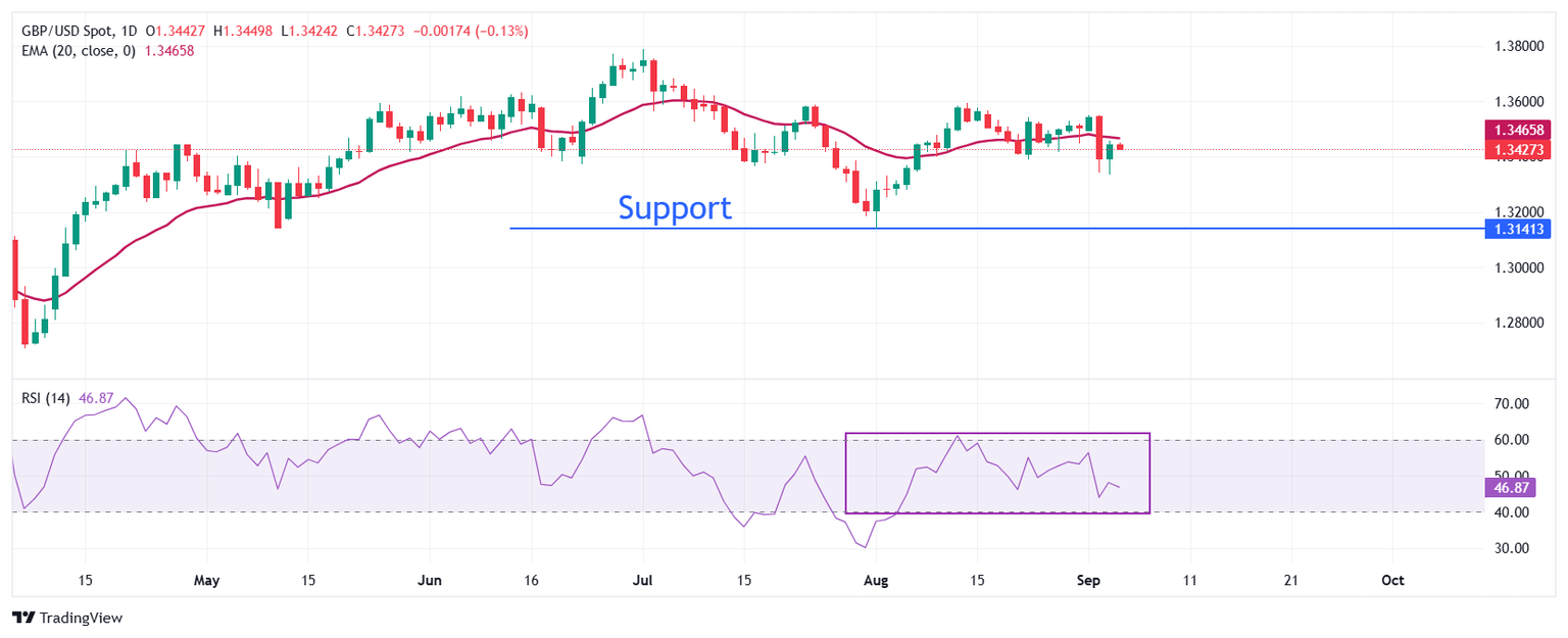 La Libra esterlina baja a cerca de 1.3435 frente al Dólar estadounidense el jueves. La tendencia a corto plazo del par GBP/USD se ha vuelto bajista ya que cotiza por debajo de la Media Móvil Exponencial (EMA) de 20 días, que está alrededor de 1.3463.