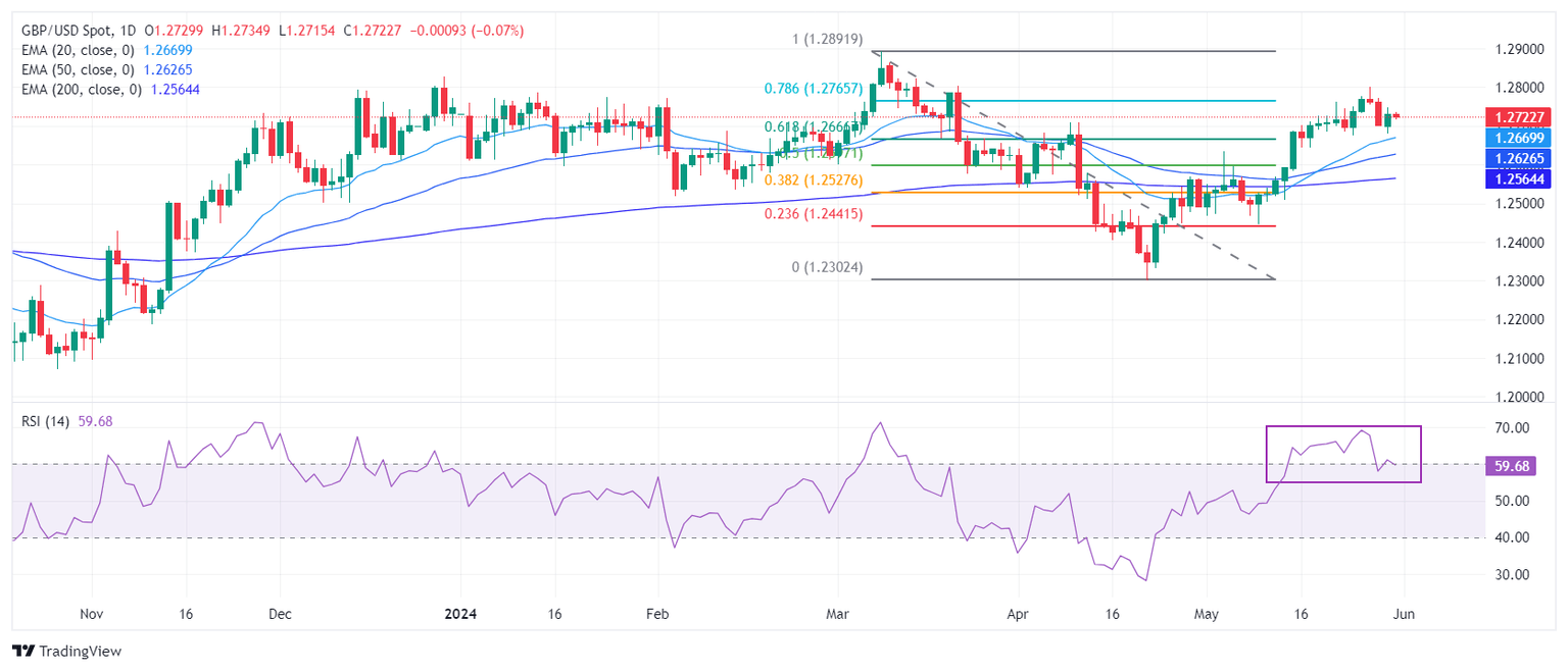 La Libra esterlina revive las pérdidas intradía frente al Dólar estadounidense tras la publicación de los datos del Índice de Precios del PCE subyacente de EE.UU. para abril. Las perspectivas a corto plazo del par GBP/USD siguen siendo optimistas ya que se mantiene por encima de 1.2670, el 61.8% de retroceso de Fibonacci (trazado desde el máximo del 8 de marzo de 1.2900 hasta el mínimo del 22 de abril en 1.2300). Se espera que el par extienda su alza hacia el 78.6% de retroceso de Fibonacci cerca de 1.2770.