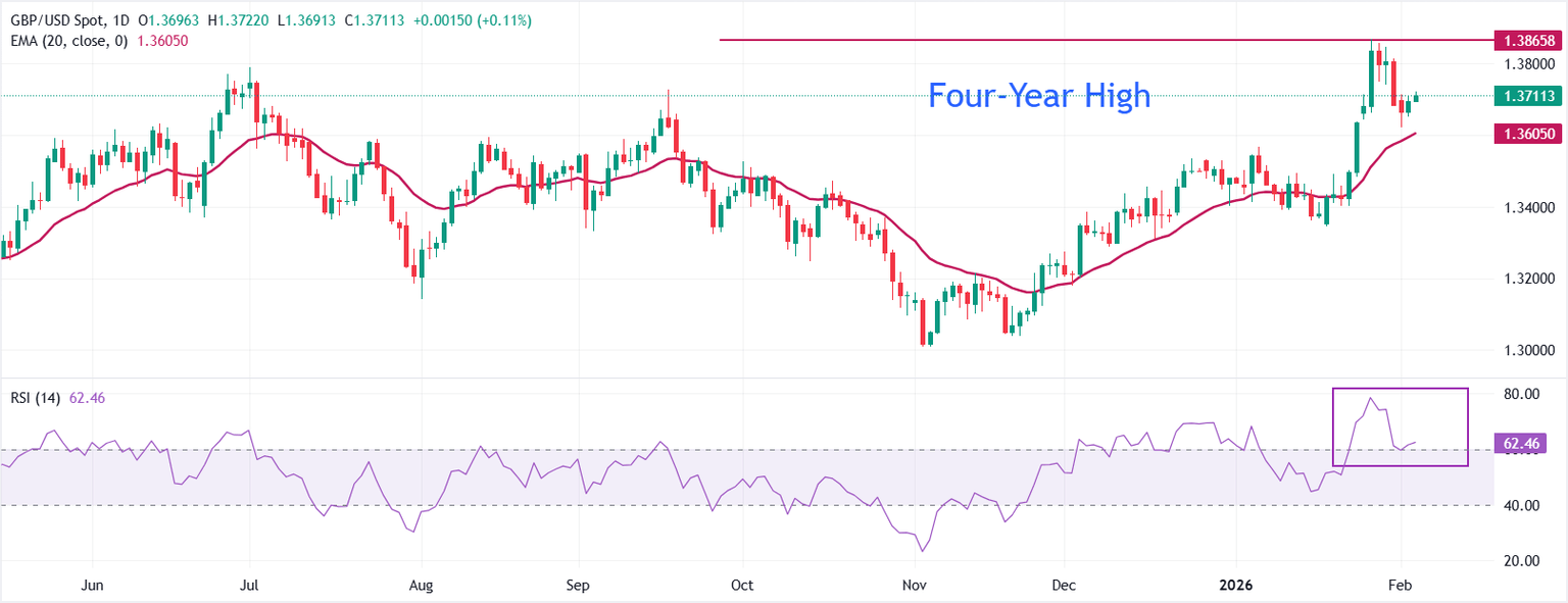 El GBP/USD cotiza al alza alrededor de 1.3712 al momento de escribir. El par se mantiene por encima de la media móvil exponencial (EMA) de 20 días en 1.3605, manteniendo la tendencia a corto plazo apuntando al alza. La EMA de 20 días se ha fortalecido en las últimas sesiones, señalando una creciente presión alcista.