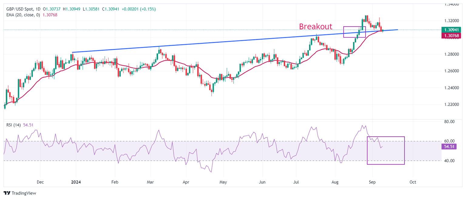 La Libra esterlina se estabiliza por debajo de la resistencia de nivel redondo de 1.3100 frente al Dólar estadounidense. El par GBP/USD está en un punto decisivo mientras se mantiene cerca de la línea de tendencia trazada desde el máximo del 28 de diciembre de 2023 en 1.2828. El 21 de agosto, la Libra realizó un movimiento alcista pronunciado tras una ruptura de la línea de tendencia mencionada. El par ha encontrado un soporte intermedio cerca de la media móvil exponencial (EMA) de 20 días, que cotiza alrededor de 1.3075.