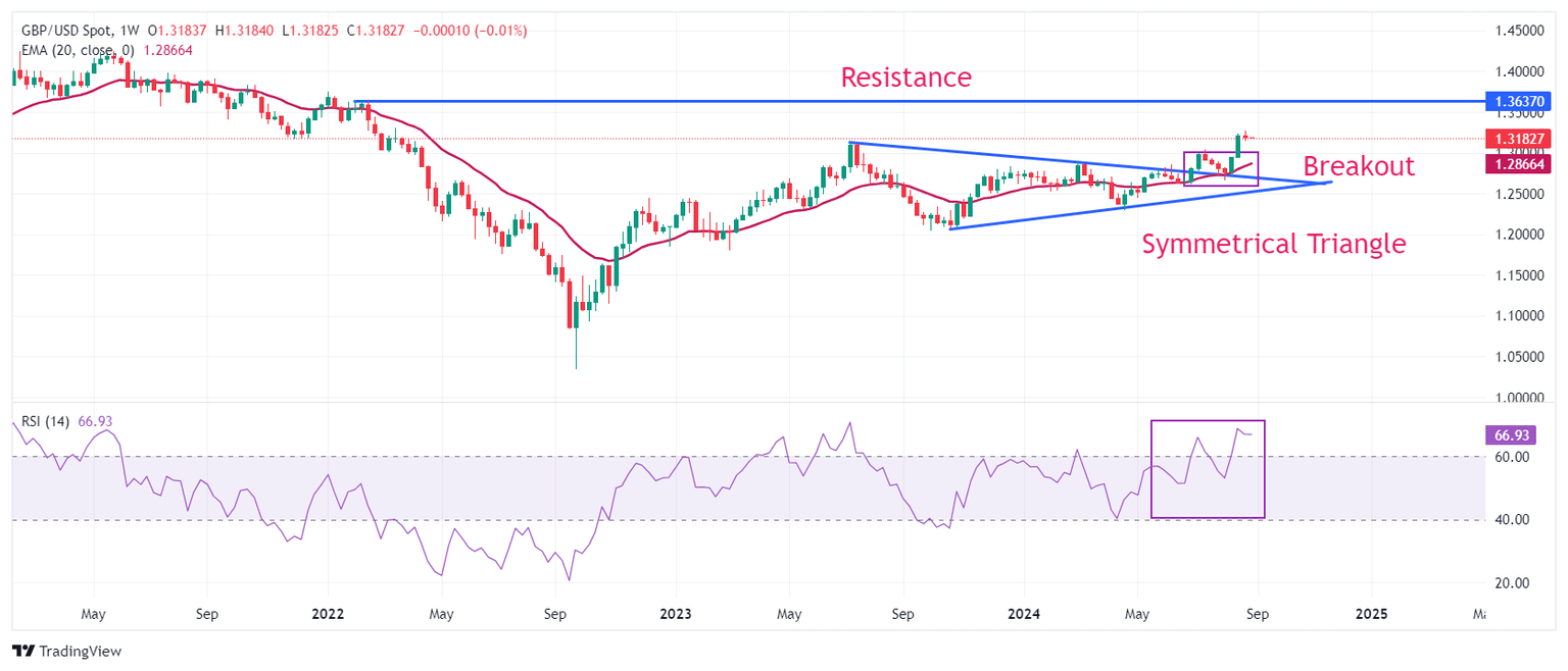 La media móvil exponencial (EMA) de 20 semanas con pendiente ascendente cerca de 1.3000 sugiere una fuerte tendencia alcista.