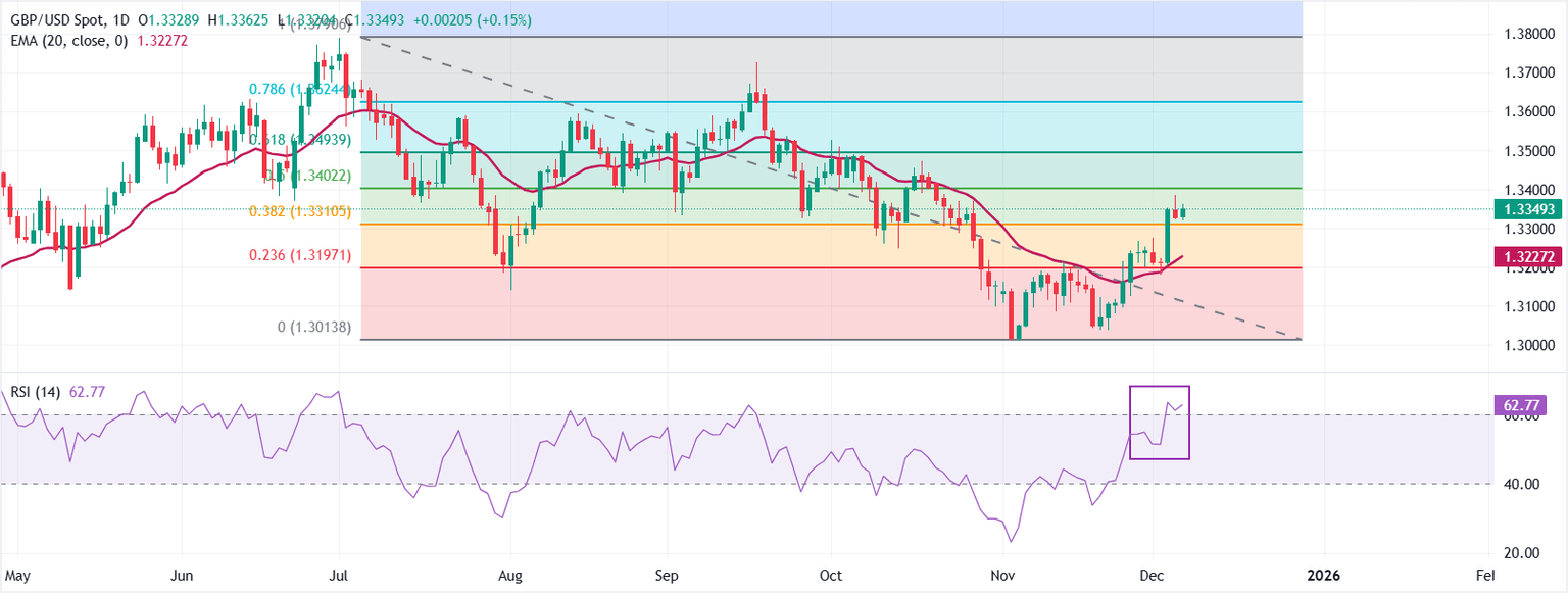 El impulso sigue siendo favorable, mientras el precio se mantiene por encima de la EMA de 20 días en ascenso. Un cierre diario por encima del retroceso de Fibonacci del 50% en 1.3402 reforzaría el tono alcista y abriría espacio para una continuación hacia el máximo del 17 de octubre de 1.3471. Por el contrario, la falta de ruptura de esa barrera mantendría al par en consolidación, con retrocesos inclinándose hacia el área del 38.2% de Fibonacci y el soporte de tendencia.