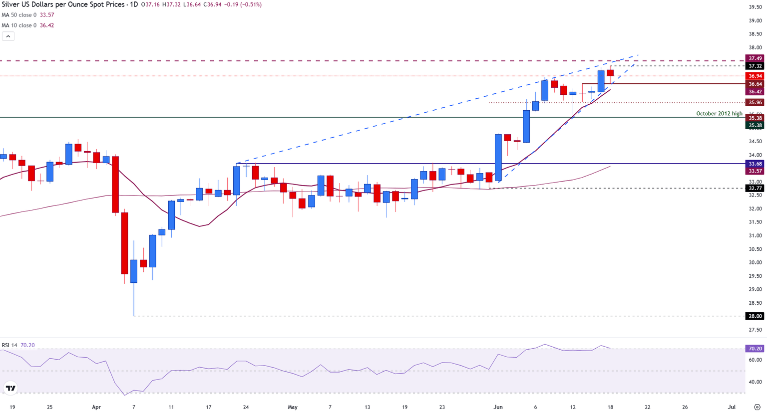 Análisis técnico de la Plata: XAG/USD se detiene por debajo de 37.00$ con el RSI amenazando condiciones de sobrecompra
