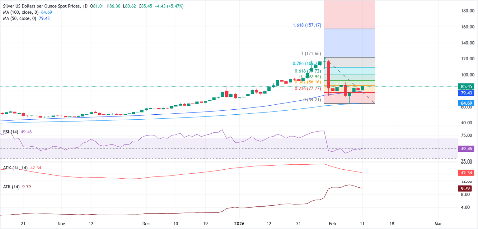 Desde una perspectiva técnica, el XAG/USD está intentando estabilizarse tras la fuerte venta desde los recientes máximos, con el precio manteniéndose cerca del retroceso de Fibonacci del 38.2% del repunte de 64.04$ a 121.66$, ubicado cerca de 85.75$.