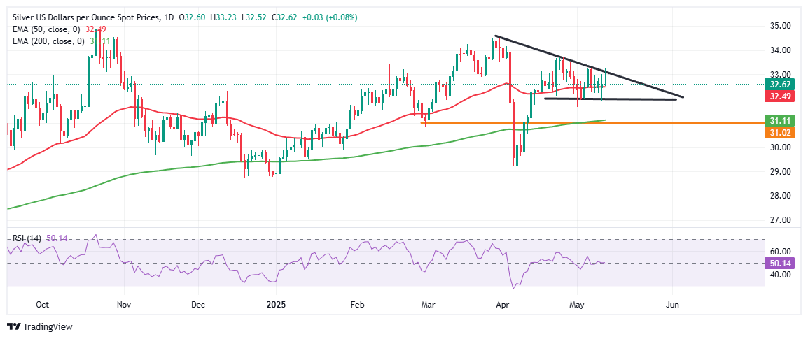 La Plata (XAG/USD) se encuentra por encima de la media móvil exponencial (EMA) de 50 días cerca de 32.50$ al momento de escribir el martes. Sin embargo, el metal blanco experimentó una notable volatilidad, inicialmente subiendo cerca del 2% durante la sesión asiática. Aún así, el rally perdió fuerza antes de la publicación del Índice de Precios al Consumidor (IPC) de EE.UU., con el XAG/USD retrocediendo y borrando todas las ganancias intradía a medida que los operadores se volvían cautelosos. Desde entonces, el metal ha encontrado cierta estabilidad tras un dato de inflación más débil de lo esperado, reavivando las esperanzas de un recorte de tasas de interés por parte de la Reserva Federal (Fed) en los próximos meses.