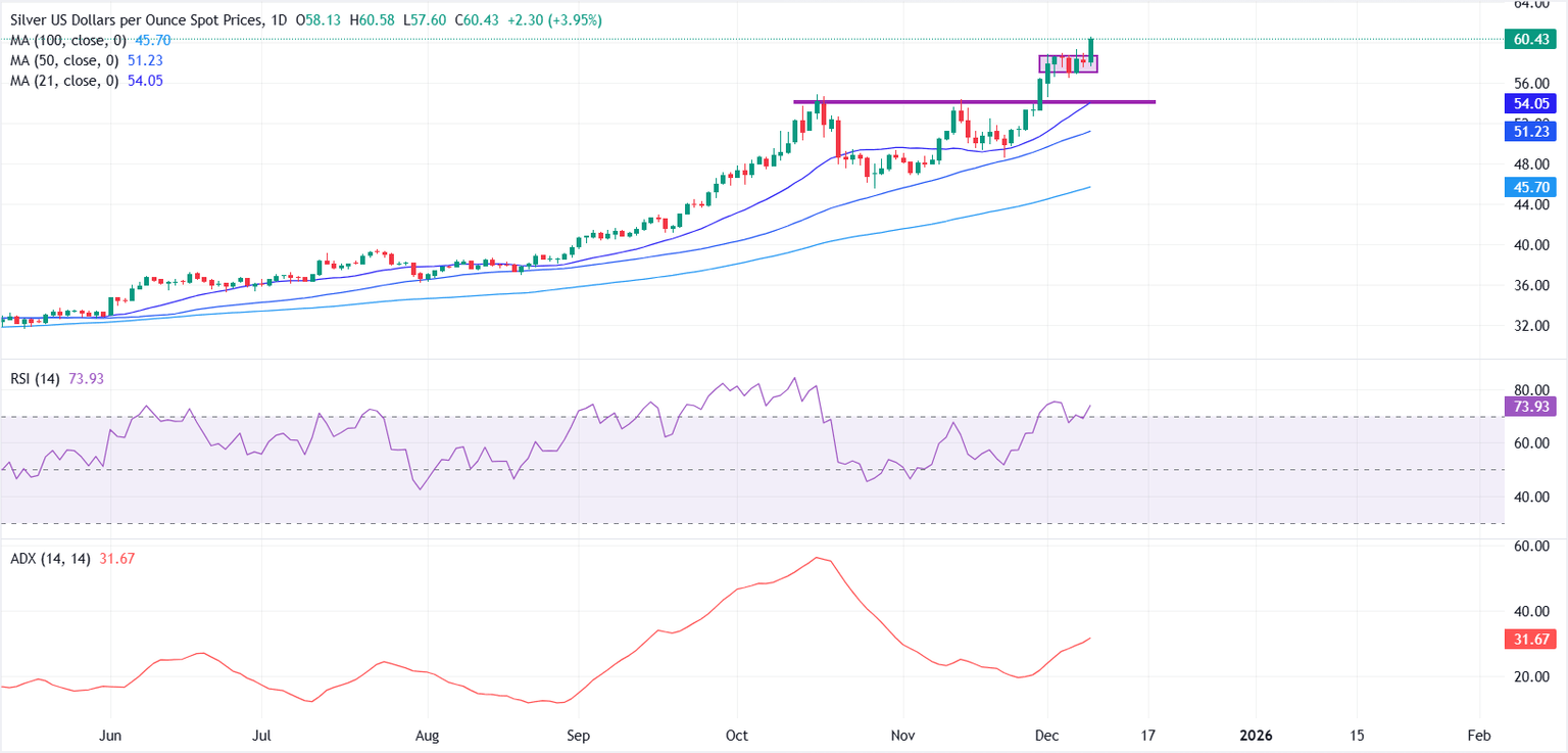 La Plata (XAG/USD) extiende su histórica carrera el martes, superando la marca de 60$ por primera vez a medida que el impulso alcista se acelera antes de la decisión sobre la tasa de interés de la Reserva Federal (Fed). El metal ha subido más del 100% en lo que va del año, apoyado por un cambio moderado en las expectativas de tasas de la Fed, el endurecimiento de las condiciones de suministro físico y una fuerte demanda tanto de usuarios industriales como de inversores.