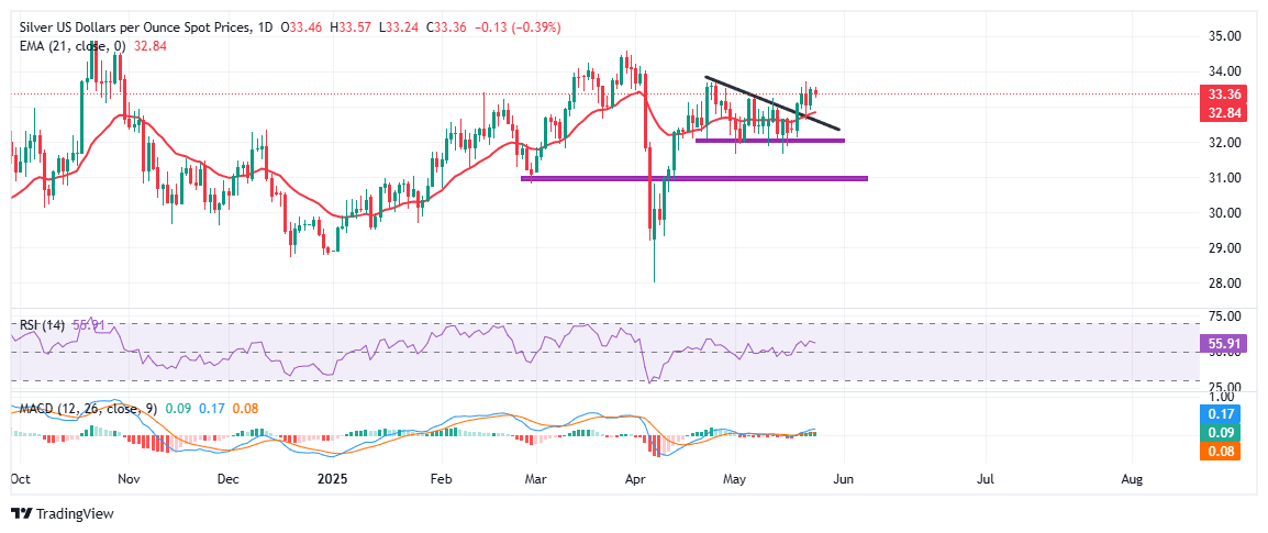 Al observar el gráfico diario, el XAG/USD confirmó la semana pasada un breakout de un patrón de triángulo simétrico de varias semanas que había limitado el impulso alcista desde mediados de abril y principios de mayo. Los precios al contado superaron la resistencia de la línea de tendencia descendente la semana pasada el martes, con compras de continuación el miércoles y una prueba de la línea de tendencia el jueves. Desde el clásico breakout-retest, el precio se ha mantenido lateral. Este breakout fue confirmado con múltiples cierres diarios por encima del patrón gráfico del triángulo alrededor de 32.60$–32.80$, que se alinea estrechamente con la media móvil exponencial (EMA) de 21 días.