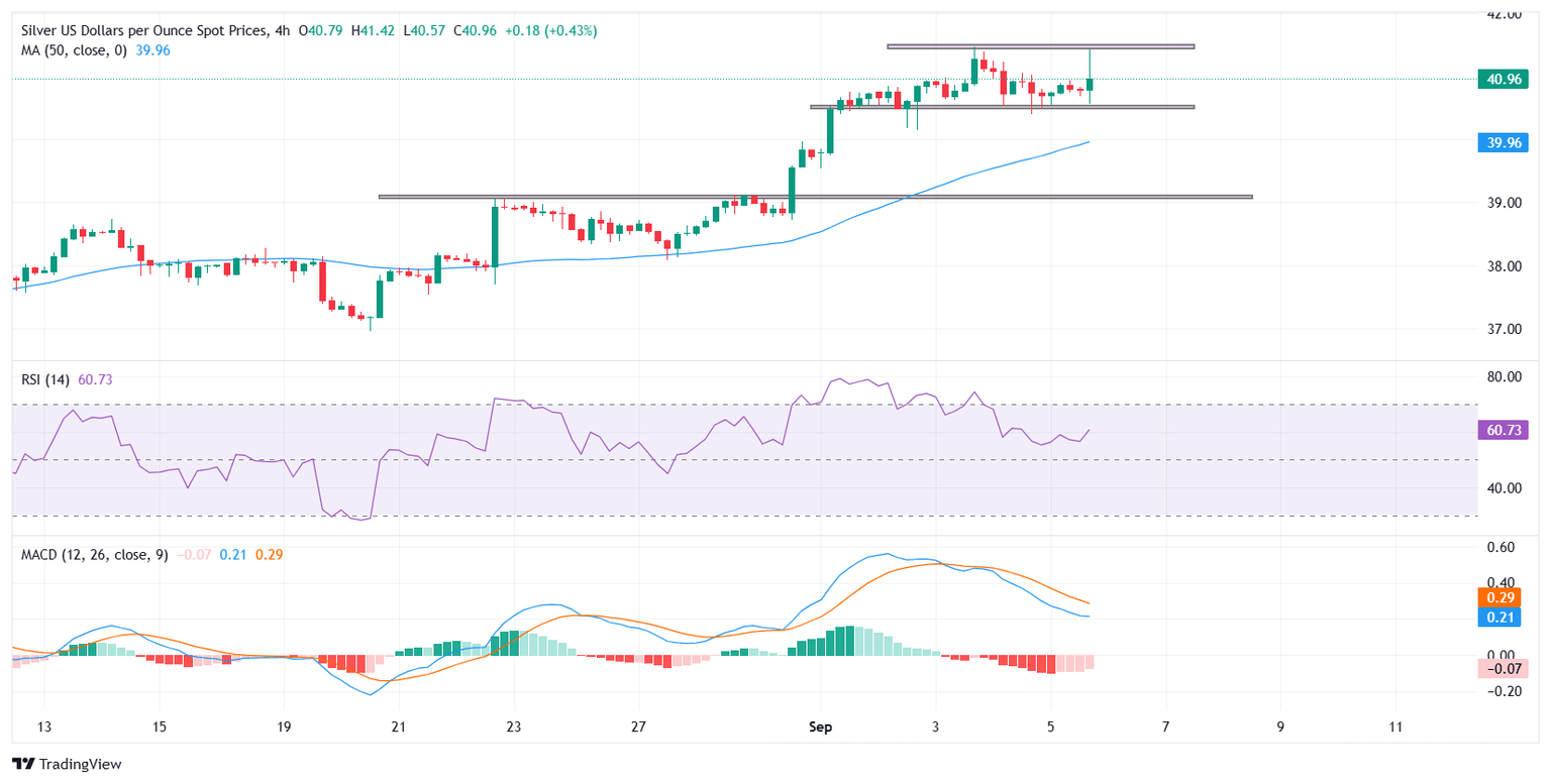 La Plata (XAG/USD) se mantiene firme alrededor de 41.00$ el viernes después de volver a probar máximos de varios años tras los datos débiles de las Nóminas no Agrícolas (NFP) de EE.UU. El metal alcanzó un pico de 41.47$ el miércoles, su nivel más fuerte desde septiembre de 2011, antes de ceder ligeramente el jueves. Un Dólar estadounidense (USD) en general más débil y la caída de los rendimientos del Tesoro tras el decepcionante informe de empleo están alimentando un nuevo interés de compra, con los mercados cada vez más convencidos de que la Reserva Federal (Fed) recortará tasas más adelante este mes.