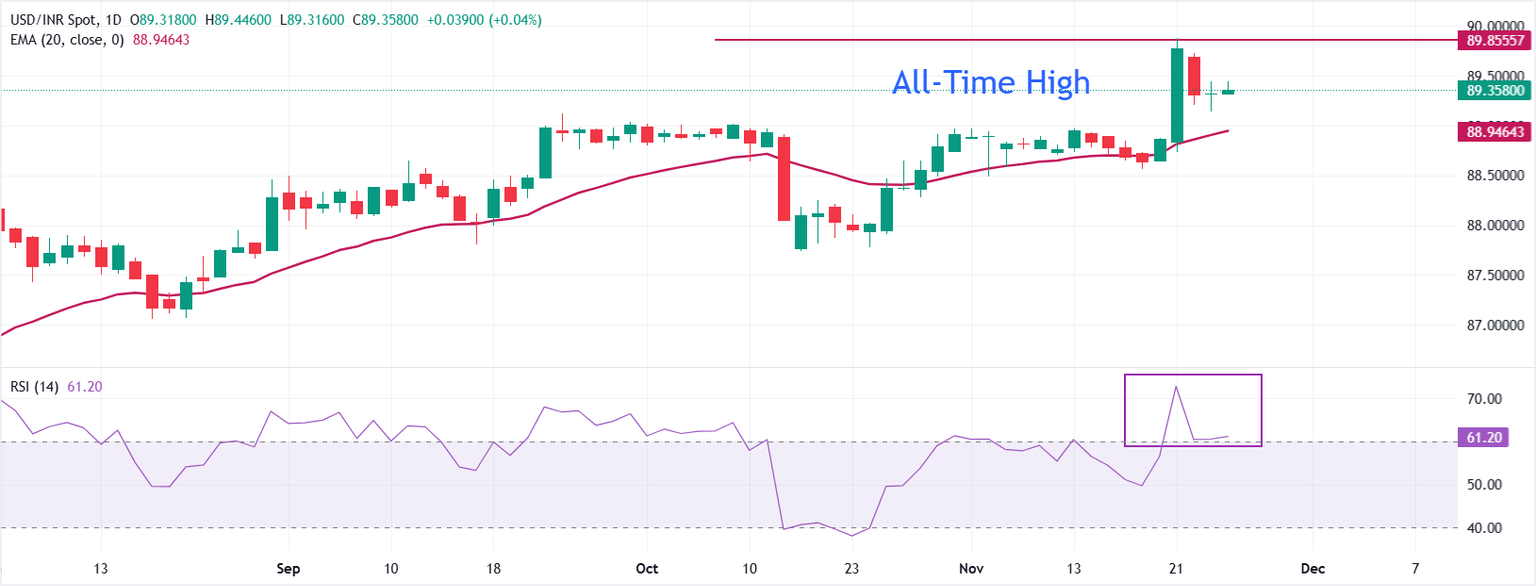 La Rupia india (INR) baja al abrir frente al Dólar estadounidense (USD) el miércoles. El par USD/INR sube cerca de 89.35 mientras la Rupia india continúa con un rendimiento inferior, con una demanda persistente del Dólar estadounidense por parte de importadores indios y en el mercado offshore.