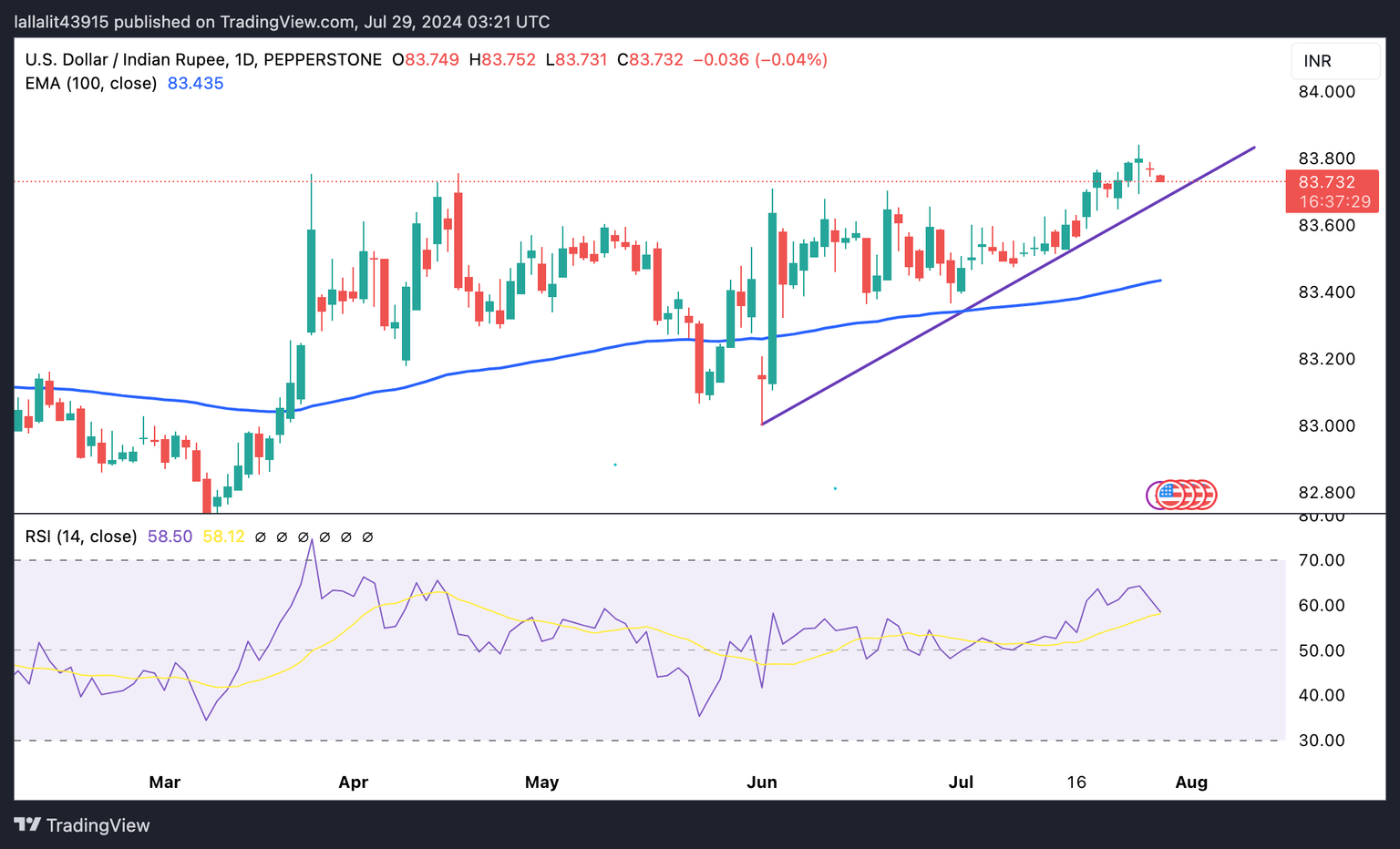 Las velas japonesas alcistas por encima del máximo histórico de 83.85 podrían atraer suficientes compradores para empujar al USD/INR hasta el nivel psicológico de 84.00.