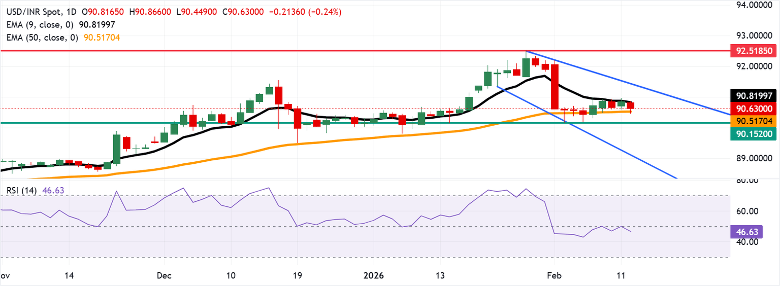 El USD/INR se cotiza alrededor de 90.60 en el momento de escribir. El análisis del gráfico diario sugiere un sesgo bajista predominante, con el par moviéndose dentro de un canal descendente. La media móvil exponencial (EMA) de 50 días tiende al alza, manteniendo el sesgo más amplio inclinado hacia arriba mientras el precio se mantiene por encima de ella. La EMA de nueve días se ha aplanado en 90.8611 y limita los rebotes a corto plazo, con el spot flotando justo por debajo de ella. El Índice de Fuerza Relativa (RSI) de 14 días imprime 49.74 (neutral), indicando un impulso equilibrado tras enfriarse de lecturas recientes sobrecompradas.