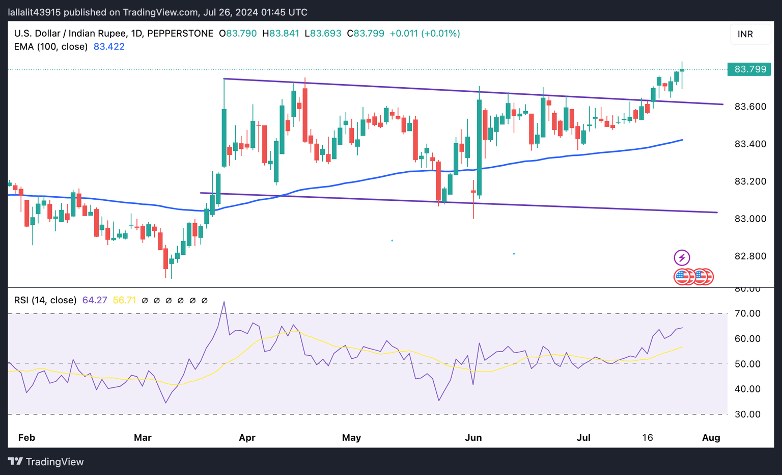 La Rupia india cotiza con leves ganancias en el día. El par USD/INR mantiene la tendencia alcista, caracterizada por una línea de tendencia alcista mientras se mantiene por encima de la media móvil exponencial (EMA) de 100 días en el marco temporal diario. Además, el Índice de Fuerza Relativa (RSI) de 14 días se mantiene por encima de la línea media cerca de 62,45, lo que indica impulso alcista.