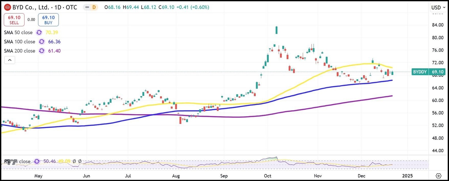 Las ventas han estado aumentando en 2024 a medida que BYD gana cuota de mercado a Tesla, Ford (F) y General Motors (GM). Incluso se dice que los recientes planes de fusión anunciados entre Honda y Nissan se basan en competir con la superior tecnología de las firmas automotrices chinas como BYD.