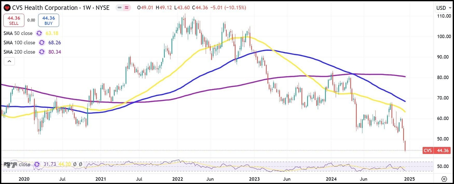 Dos problemas separados se han unido para golpear el precio de las acciones de CVS últimamente. Primero, el asesinato del CEO de UnitedHealthcare en Midtown Manhattan el 4 de diciembre ha asustado a toda la industria de seguros de salud debido a su impopularidad general con el público.