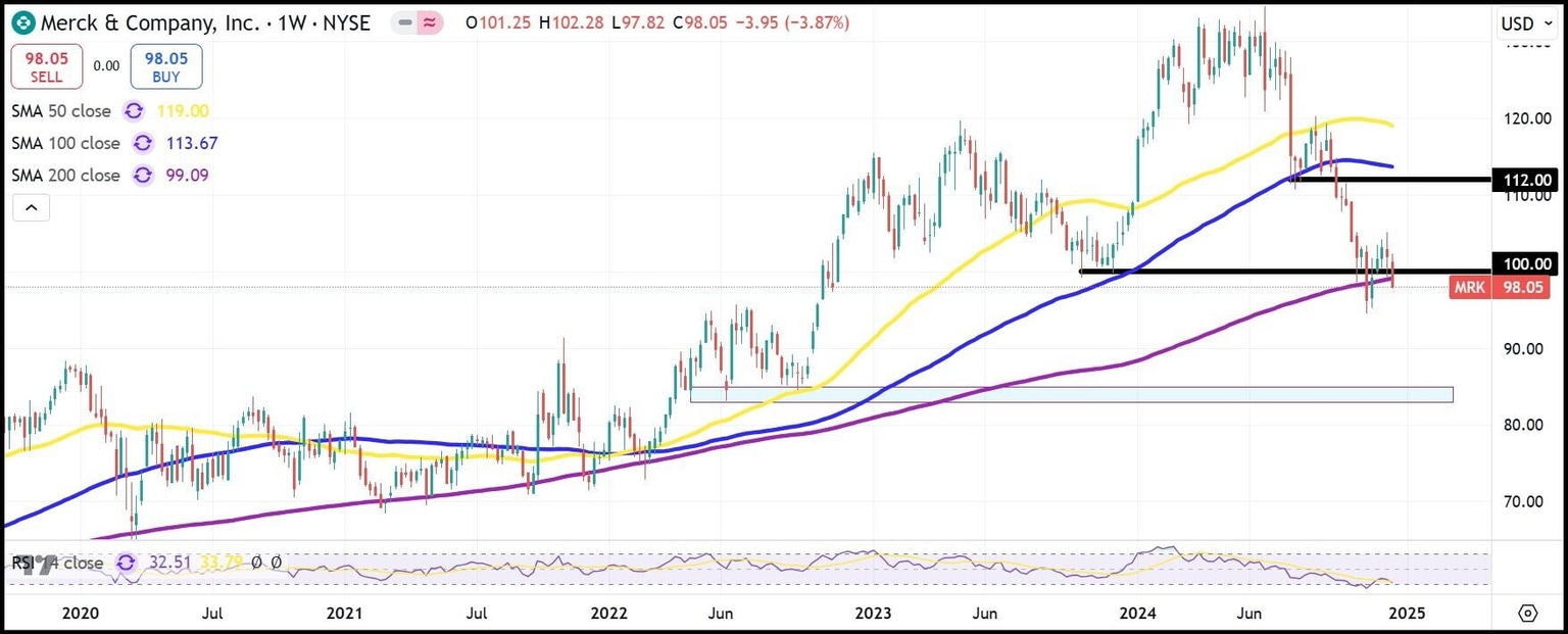 Merck (MRK) es otra acción de salud, esta vez una farmacéutica, que debería beneficiarse en 2025. Las acciones de la compañía con sede en Nueva Jersey han caído de los 130 $ a menos de 100 $ a finales de este año, pero los vientos en contra parecen exagerados.