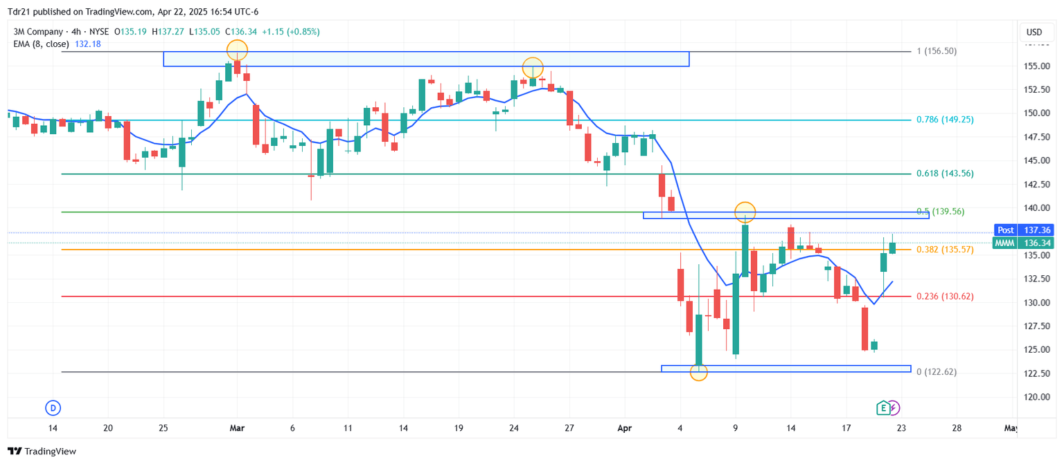 Los títulos de MMM establecieron un soporte de corto plazo dado por el mínimo del 7 de abril en 122.59$. Al alza, la resistencia más cercana se encuentra en 139.22$, máximo del 9 de abril. La siguiente resistencia clave la observamos en 155.47$, punto pivote del 3 de marzo.