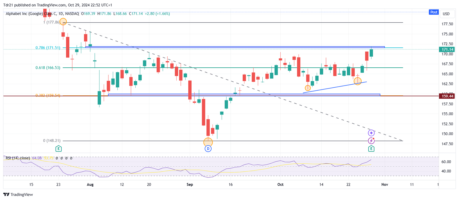 Las acciones de Alphabet reaccionaron al alza desde un soporte de corto plazo dado por el mínimo del 24 de octubre en 162.77$. La siguiente zona de soporte clave la observamos en 161.12$, punto pivote del 9 de octubre cercano al retroceso de 38.50% de Fibonacci. La resistencia más cercana se encuentra en 177.86$, máximo del 24 de julio.