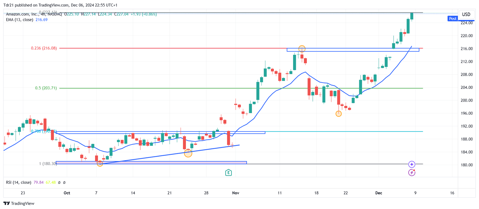 La empresa líder en comercio electrónico y servicios de computación en la nube, Amazon (AMZN), anunció el lanzamiento de nuevos servidores equipados con sus propios chips de inteligencia artificial. Estas innovaciones han complacido a los inversionistas, reflejando su confianza en un repunte de seis sesiones consecutivas al alza, de las cuales las últimas tres jornadas han establecido máximos históricos, el más reciente en 227.15$, alcanzado el día de hoy.
