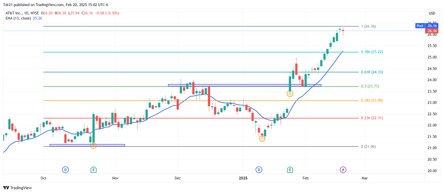 - T finaliza con una racha de ocho sesiones consecutivas con ganancias, alcanzando mínimos del 18 de febrero en 25.94$.