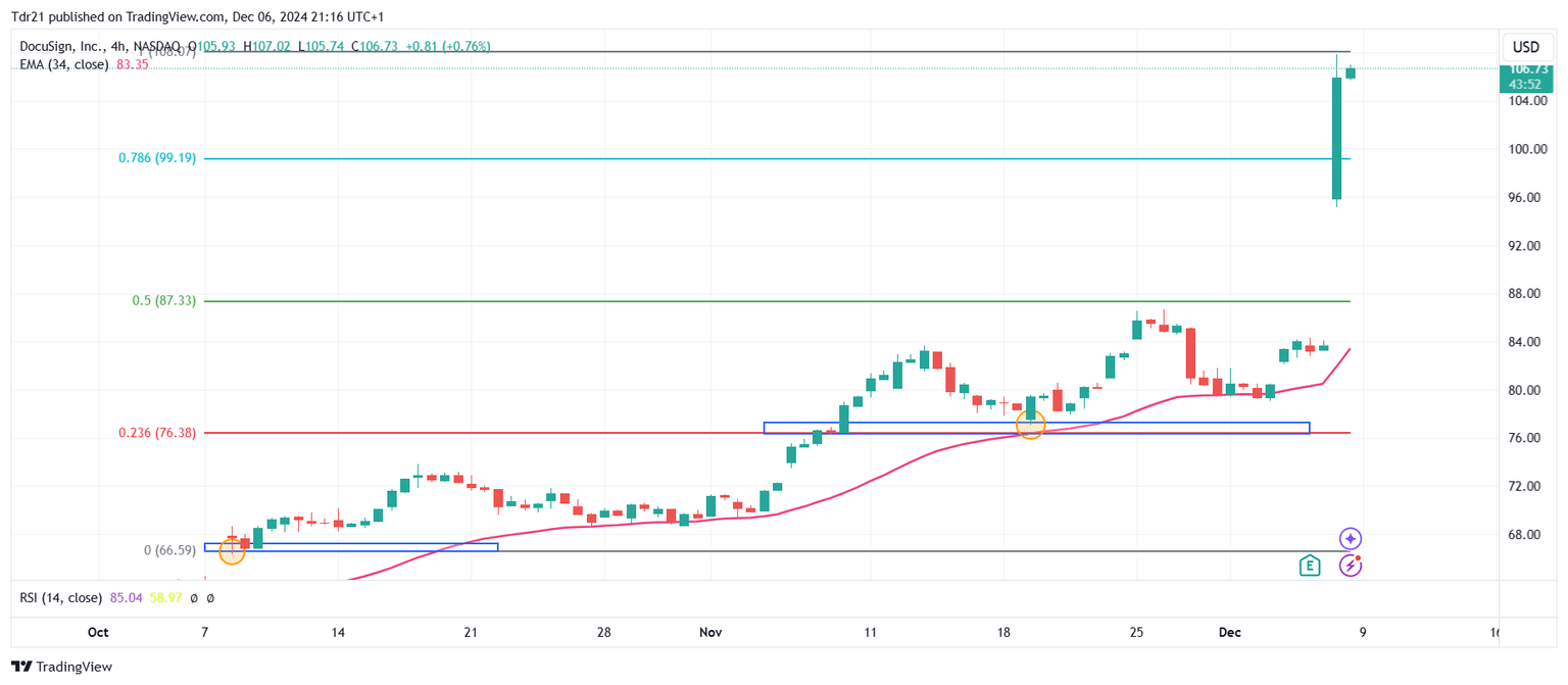 Las acciones de DOCU reaccionaron al alza desde un soporte recorto plazo dado por el mínimo del 19 de noviembre en 77.08$ en convergencia con el retroceso al 23.6% de Fibonacci. El el siguiente nivel de soporte clave se encuentra en 66.36$, punto pivote del 8 de octubre. Al alza, proyectamos una posible toma de beneficios en 130.00, número cerrado que confluye con la extensión al 1.618% de Fibonacci.