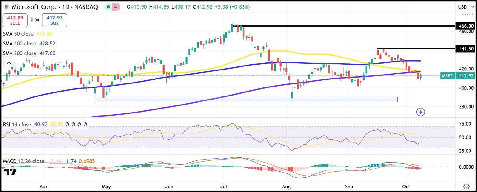 Las acciones de Microsoft están ahora en su cuarta semana de tendencia a la baja. Durante su rango alto a mediados de septiembre, MSFT encontró unaresistencia en 441.50 $. Su máximo histórico a principios de julio cerca de 466 $ tiene ahora tres meses, y en las últimas dos semanas el precio de las acciones de Microsoft ha cruzado por debajo de las medias móviles simples (SMA) de 50, 100 y 200 días.