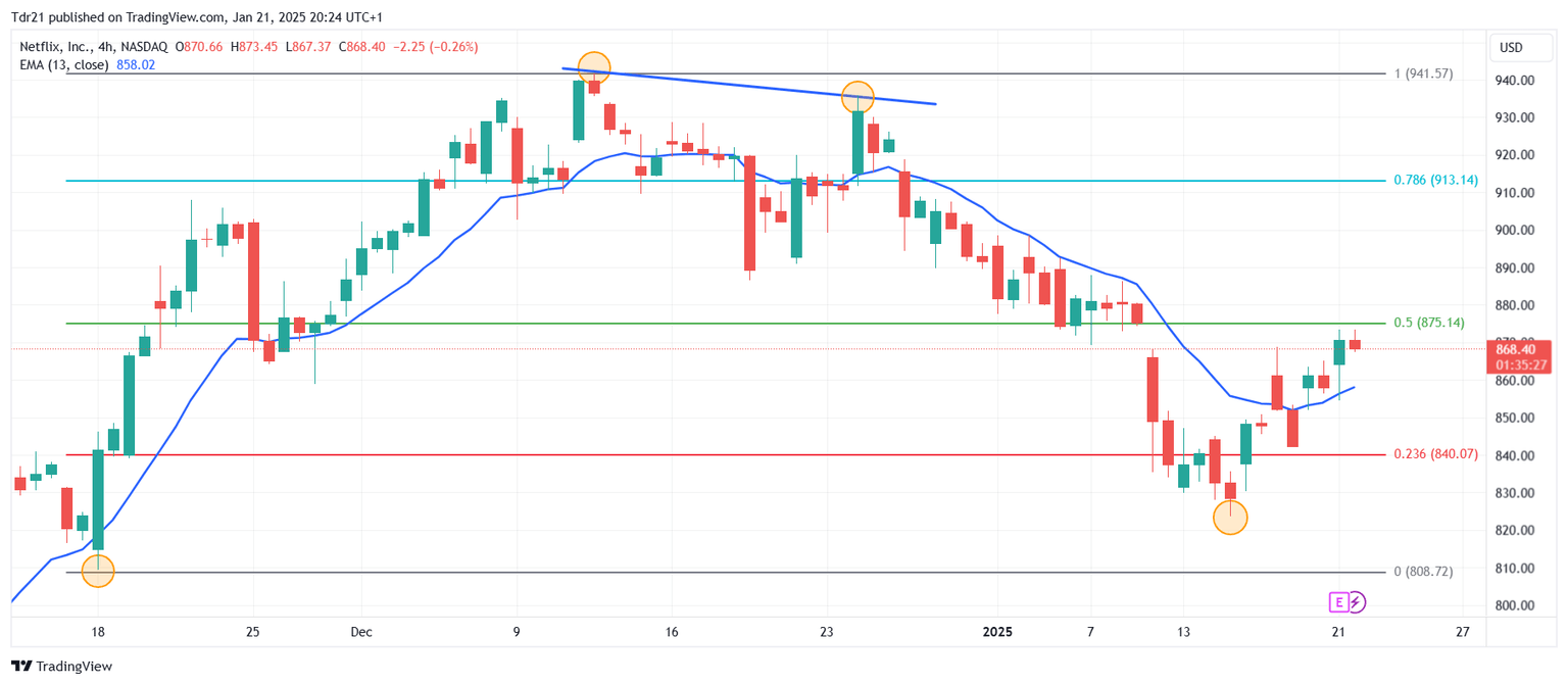 Las acciones de NFLX reaccionaron al alza desde un soporte dado por el mínimo del 14 de enero en 823.63$. La resistencia más cercana la observamos en 935.95$, máximo del 24 de diciembre de 2024. La siguiente zona de resistencia clave se encuentra en 941.56$, punto pivote del 11 de diciembre de 2024.