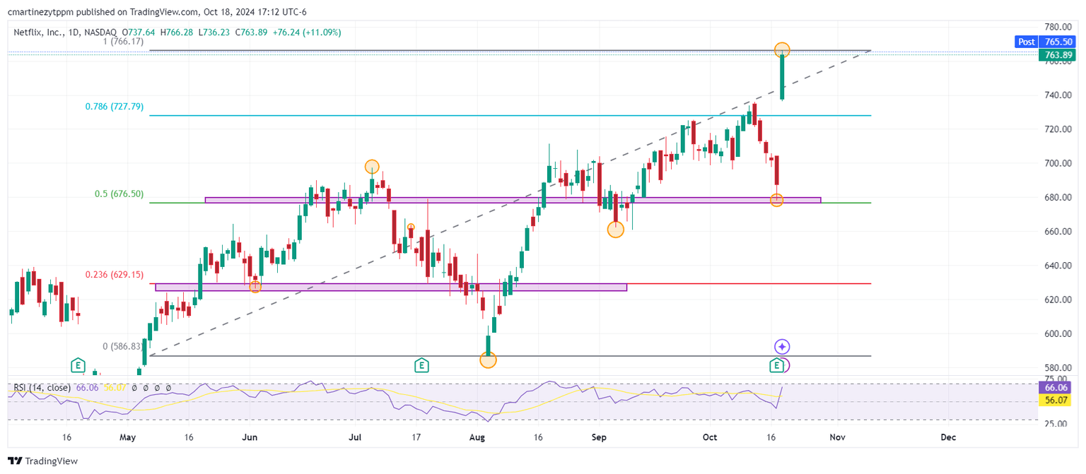 Netflix inició la jornada del día de hoy estableciendo un mínimo diario en 736.23 $, atrayendo compradores agresivos que llevaron el precio de su acción a un nuevo máximo histórico en 766.28 $. Actualmente, Netflix opera en 763.89 $ ganando un 11.10% al finalizar la sesión.