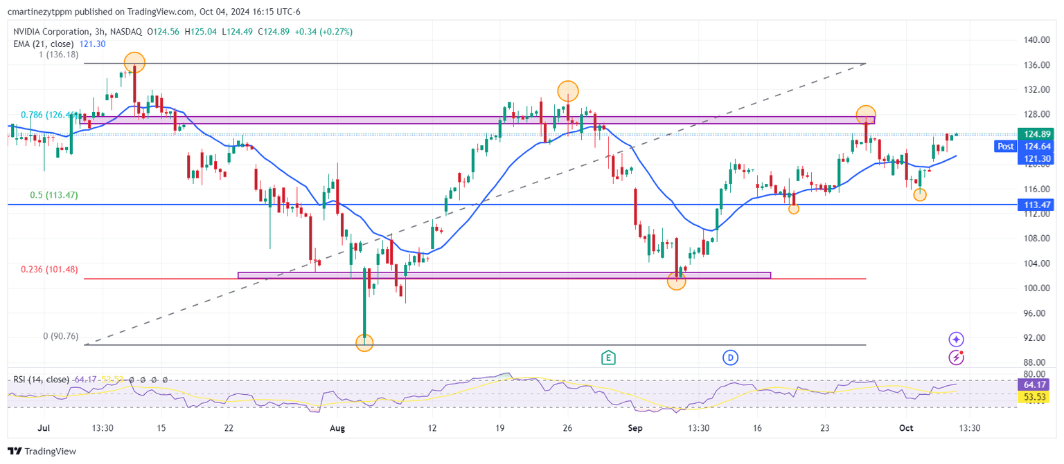 Nvidia (NVDA) estableció un mínimo del día en 121.83 dólares, encontrando compradores agresivos que llevaron el precio de la acción a máximos no vistos desde el 26 de septiembre en 125.04 dólares. En estos momentos, los valores de NVIDIA cotizan sobre 124.92 dólares, subiendo un 1.65%.