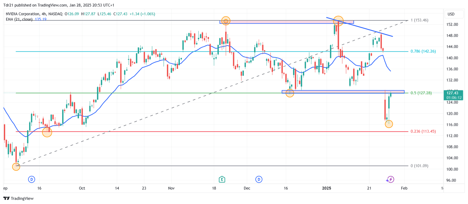 Las acciones de NVDA reaccionaron al alza desde un soporte de corto plazo, dado por el mínimo del día de hoy, cercano al retroceso del 23.6% de Fibonacci en 116.70. El siguiente nivel clave de soporte lo observamos en 100.95$, punto pivote del 6 de septiembre de 2024. Al alza, la resistencia más cercana se encuentra en 148.97$ máximo del 24 de enero.