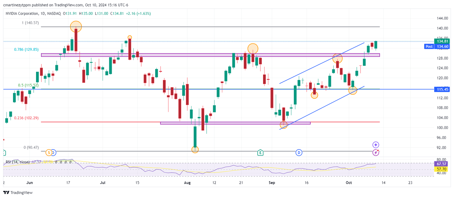 Nvidia reaccionó al alza en un soporte ubicado en 115.14 $, dado por el mínimo del 2 de octubre, en confluencia con el retroceso al 50% de Fibonacci. El siguiente nivel de soporte clave lo observamos en 100.95 $, mínimo del 6 de septiembre.