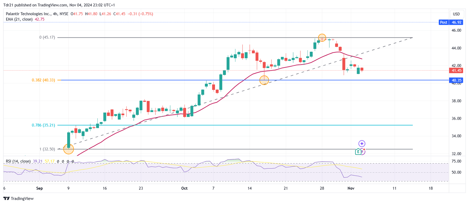 Las acciones de Palantir Technologies establecieron un soporte de corto plazo en 40.36$, mínimo del 16 de octubre en confluencia con el retroceso al 38.2% de Fibonacci. La siguiente zona de soporte la observamos en 36.06$, punto pivote del 1 de octubre, cercano al retroceso del 78.6% de Fibonacci. Al alza, la acción ha alcanzado un máximo histórico en 46.93$ durante el horario extendido, formando una resistencia de corto plazo.