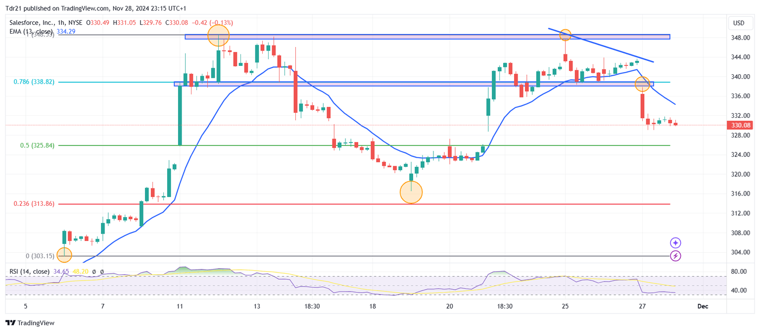 Los valores de Salesforce alcanzaron un máximo semanal en 347.85$, donde atrajeron vendedores que llevaron el precio de la acción a un mínimo de la semana en 328.88$. El día de hoy, el mercado se encuentra cerrado debido a las festividades del Día de Acción de Gracias en Estados Unidos.