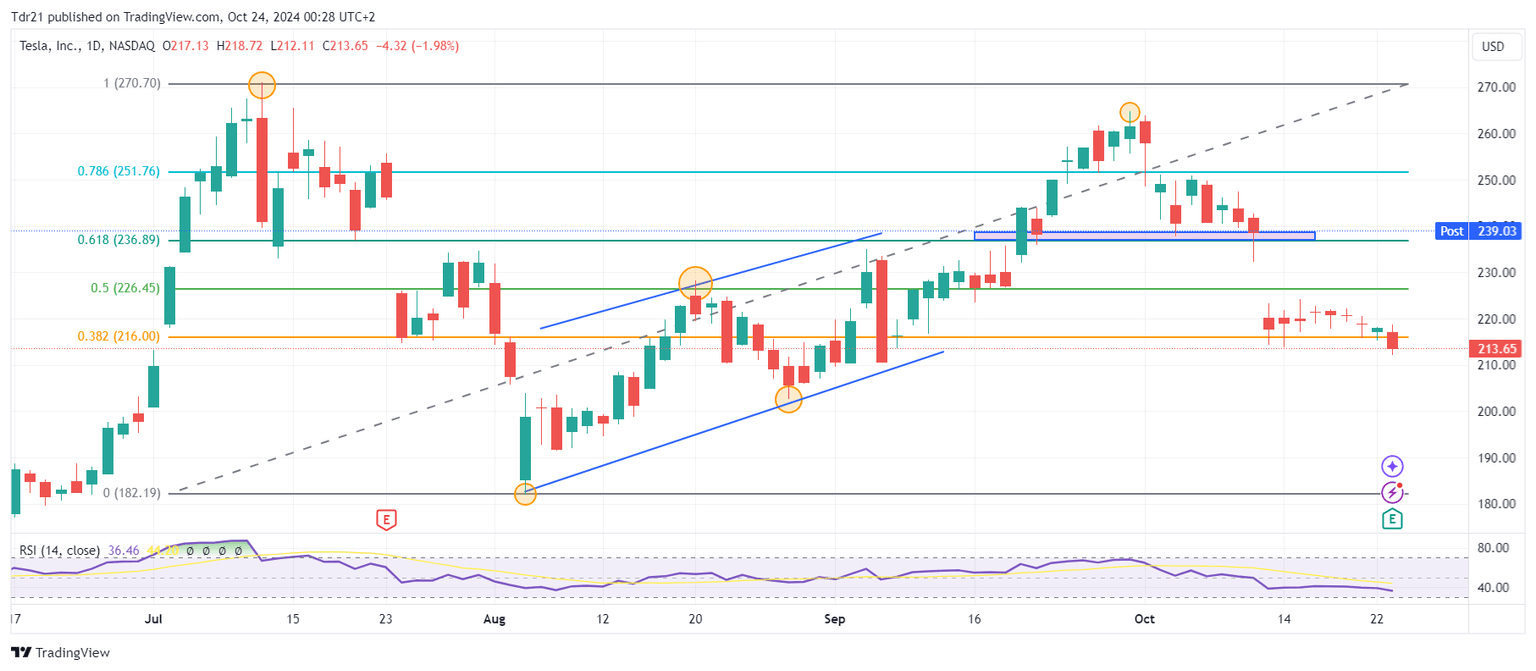 Las acciones de Tesla reaccionaron al alza cercano a 216.00 $, zona cercana al retroceso del 38 2% de Fibonacci. El siguiente nivel clave de soporte lo observamos en 182.00 punto pivote del 5 de agosto. Al alza la resistencia más cercana se encuentra en 250.96 $, máximo del 4 de octubre.