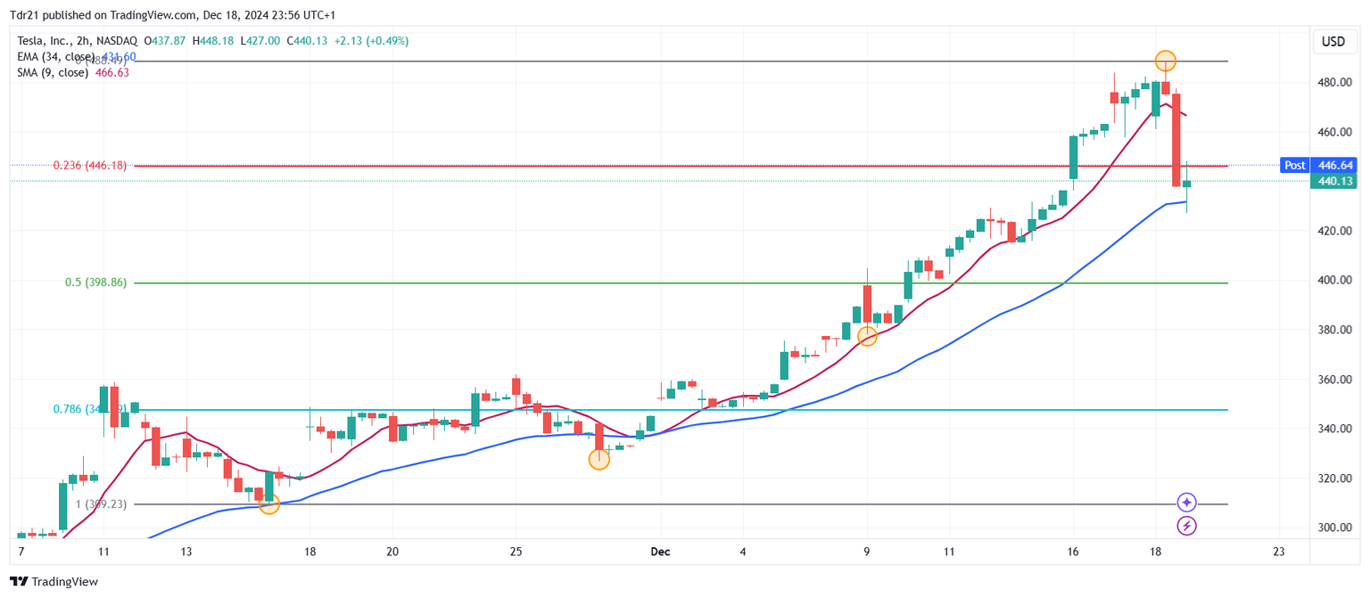 Los títulos de Tesla (TSLA) registraron un máximo del día en 488.54$, encontrando vendedores agresivos que llevaron el precio de la acción a un mínimo de tres días en 427.01$. Actualmente, TSLA opera sobre 440.13$, perdiendo un 8.28% el día de hoy.