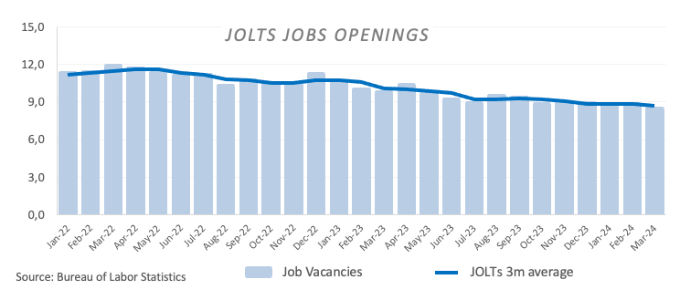 La Oficina de Estadísticas Laborales de EE.UU. (BLS) publicó el miércoles en su Encuesta de Ofertas de Empleo y Rotación Laboral (JOLTS) que, en el último día hábil de marzo, el número de ofertas de empleo alcanzó los 8,488 millones. Esta cifra fue 325.000 inferior al recuento revisado de marzo de 8,813 millones (anteriormente 8,756 millones) y decepcionó las expectativas del mercado de 8,680 millones.