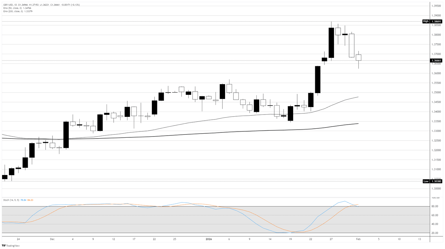 El GBP/USD se ha retirado de su reciente prueba del máximo de agosto de 2021 cerca de 1.3847, con el par ahora consolidándose en torno a la región de 1.3650. El retroceso se produce tras un fuerte repunte en enero que vio al Cable ganar más del 2% frente al Dólar, impulsado por la debilidad general del USD y datos resilientes del Reino Unido. La media móvil exponencial (EMA) de 20 días se ha estancado en torno a 1.3680, con el precio ahora probando este soporte dinámico.