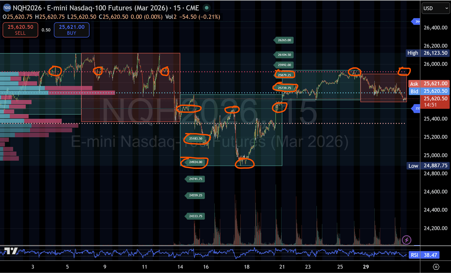 Los futuros de Nasdaq de marzo permanecen en rotación, negociándose entre el pivote central diario y la resistencia superior, sin una aceptación confirmada en la estructura superior aún.