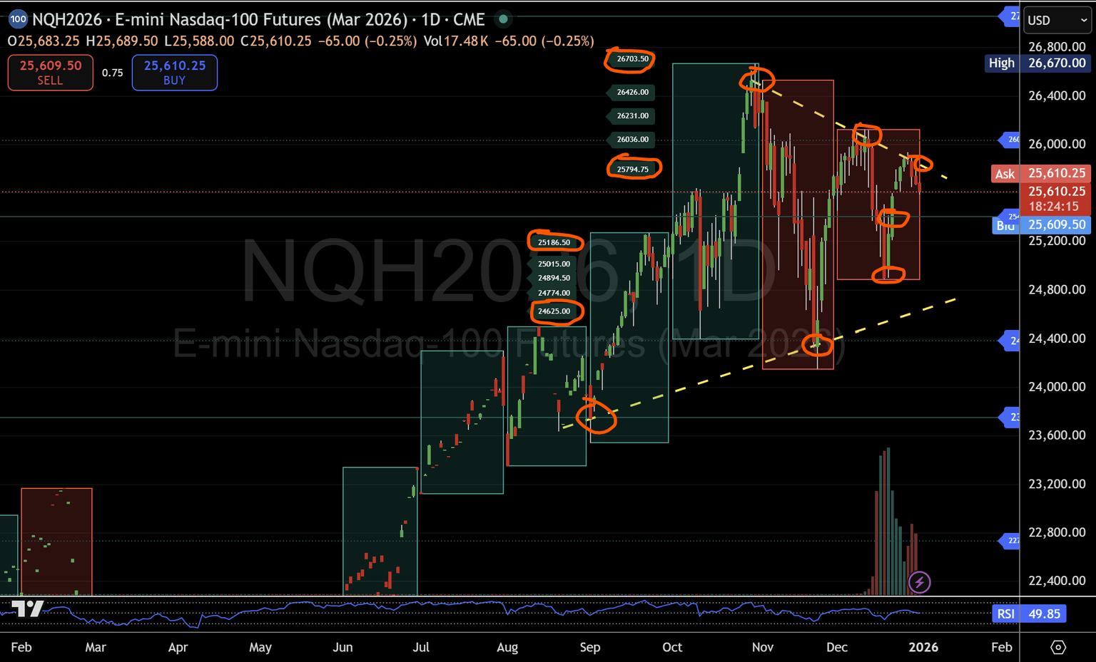 Múltiples intentos de mantenerse por encima de micro 1 (25.794) y presionar hacia la banda de resistencia micro 1–2 (25.794–26.036) han fracasado, reforzando la importancia de esta zona y la línea de resistencia descendente destacada por primera vez en la actualización de escritorio del 19 de diciembre.